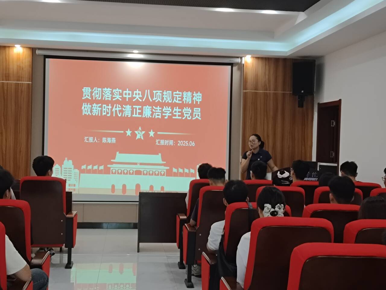 党课上,陈海燕结合典型案例,深入解读了中央八项规定精神的核心要义和现实意义,强调作风建设永远在路上。她号召员工党员作为青年骨干,要始终以高标准严格要求自己,筑牢思想防线、严守纪律底线,将廉洁自律内化于心、外化于行,在学业、生活和社会实践中发挥先锋模范作用,以务实清廉的作风展现新时代员工党员的责任担当。